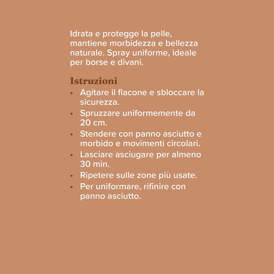 Idrata e protegge la pelle, mantiene morbidezza e bellezza naturale. Spray uniforme, ideale per borse e divani.