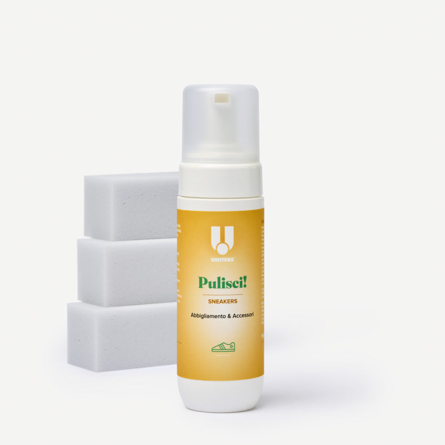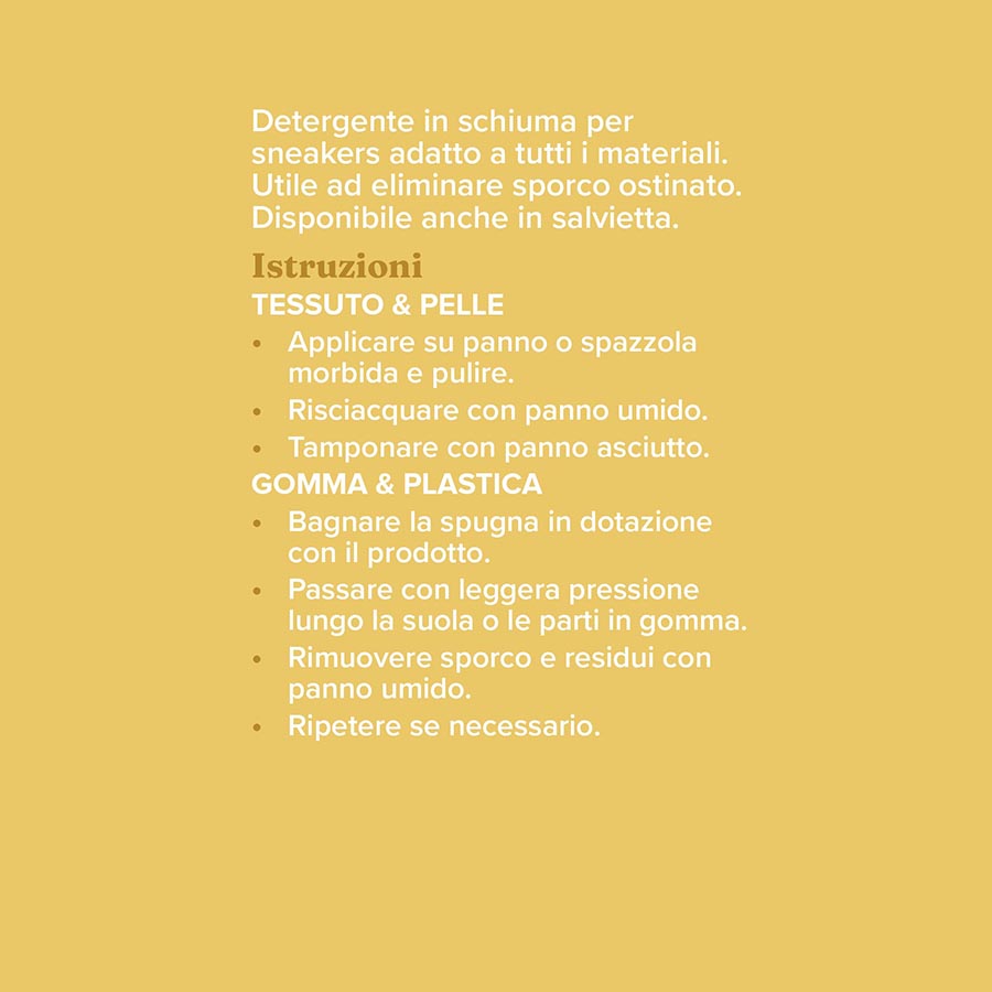 Detergente in schiuma per sneakers adatto a tutti i materiali. Utile ad eliminare sporco ostinato. Disponibile anche in salvietta.