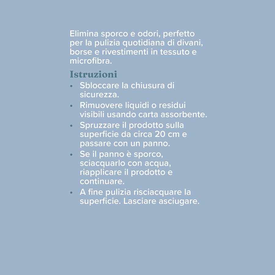 Elimina sporco e odori, perfetto per la pulizia quotidiana di divani, borse e rivestimenti in tessuto e microfibra.