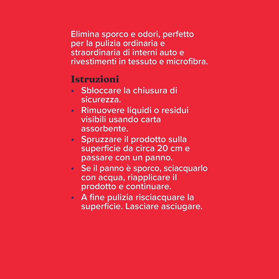 Elimina sporco e odori, perfetto per la pulizia ordinaria e straordinaria di interni auto e rivestimenti in tessuto e microfibra.