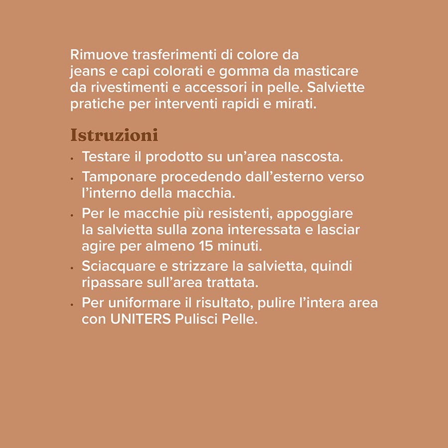 Rimuove trasferimenti di colore e jeans e gomma da masticare da rivestimenti e accessori in pelle. Salviette pratiche per interventi rapidi e mirati.